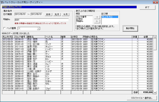 ペットクルーカルテ6の売上データから、診療明細番号を指定してカルテリスト(カルテ番号、顧客名、ペット名)を抽出、リストアップすることができます。 リストアップされたデータはCSVファイルに書き出すことができますので、MSエクセルなどの表計算ソフトで読み込んで、独自に集計、印刷が可能です。