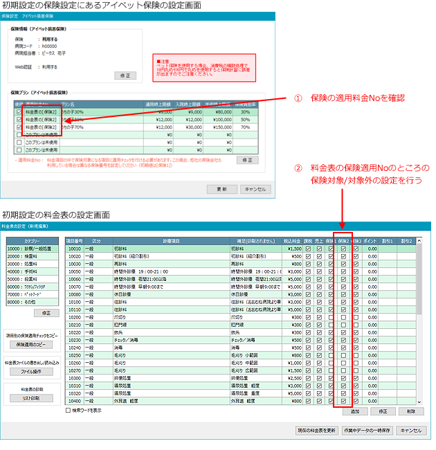 - 料金表を開き、海外製医薬品の項目に対し保険適用Noのところにチェックをつけることで保険対象になります