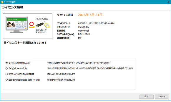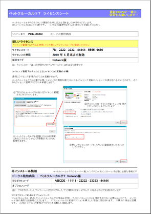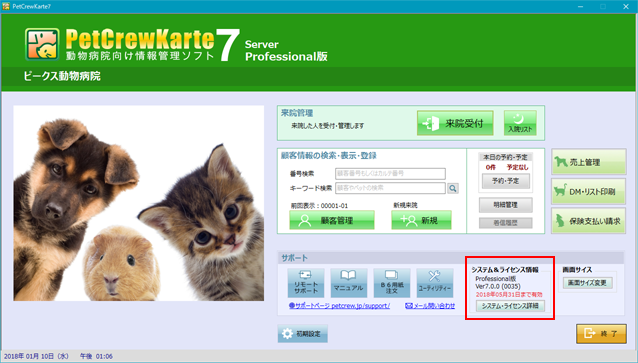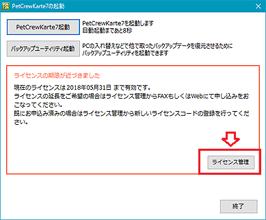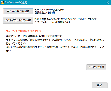 なお、ペットクルーカルテの画面上に表示されているライセンスの期限は、次回ペットクルーカルテを起動したときに新しいライセンス期限に更新されます。