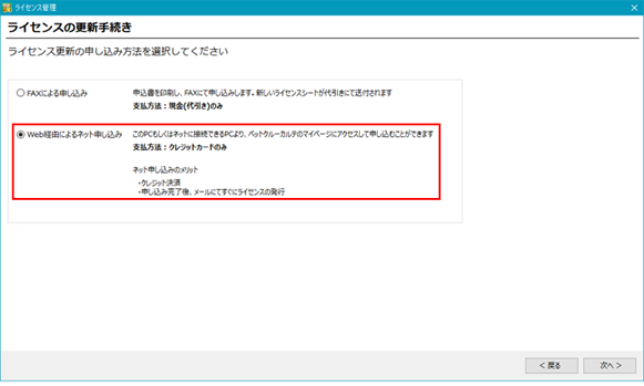 「ライセンスの更新申し込み」にチェックを付けて次の画面で申し込み方法を選んで手続きを進めます。