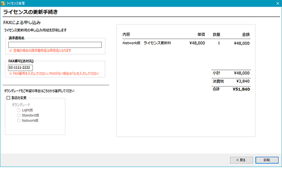 ライセンスの更新と一緒にアップグレードやダウングレードを行う場合はここで選択することができます。