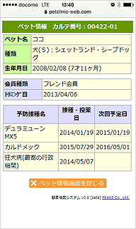 - ペット情報で表示されるのは、1.ペット名 2.種類および性別 3.品種 4.生年月日および年齢(死亡の場合は死亡日) 5.ペットメモ 6.ユーザー定義情報(新機能) 7.ワクチンなどの予防接種日および次回予定日